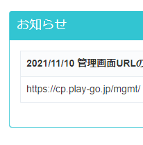 管理画面 ダッシュボード ダッシュボードについて 目次 1.メニュー 2.内容 2.1.ダッシュボード 1.メニュー 管理画面より「ダッシュボード」をクリックします。 2.内容 2.1.ダッシュボード プレイGOからのお知らせを一覧で表示します。メンテナンス、アップデート情報を確認できます。 ダッシュボード