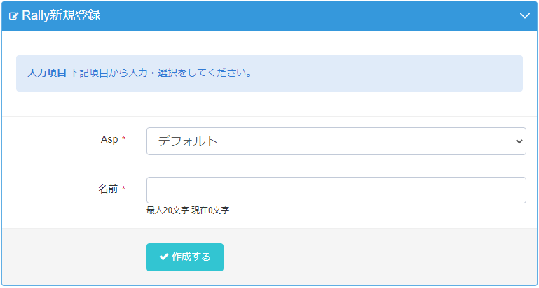 管理画面 スタンプラリー管理 スタンプラリー管理-ラリー登録 目次1.機能2.設定3.項目2.1.(必須)Asp2.2.(必須)名前1.機能 新規に登録するスタンプラリーを登録します。 2.設定 各種項目を設定します。 「作成する」ボタンを押します。 確認画面にて「はい」を押します。 3.項目 2.1.(必須)Asp スタンプラリーを使用するASPを選択します。(指定がない場合はデフォルトを選択します。) 2.2.(必須)名前 スタンプラリーを管理する名前を設定します。(最大20文字)