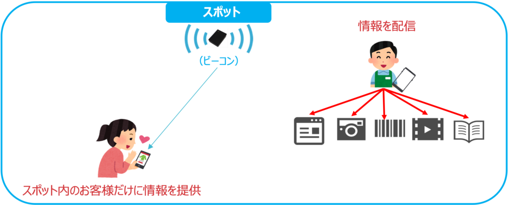 主なビーコンを利用したサービスは、スマートフォンなどの端末がその電波をキャッチ、ID番号から、場所を特定しサービスを提供しています。