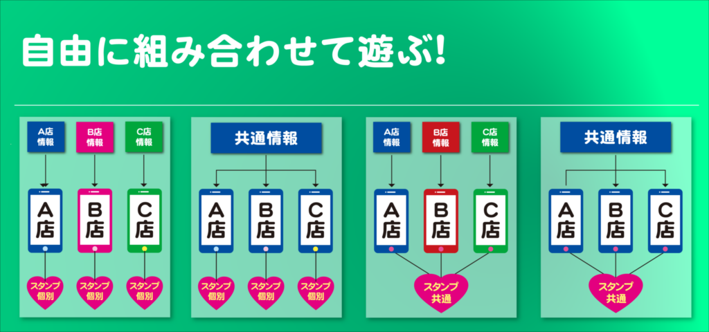 記事・来店ポイントはサービスごとに管理されていますが、チェーン店など複数サービスで記事・来店ポイント・プレゼントを共有することができます。サービスごとに設定する必要なく一括管理ができます。