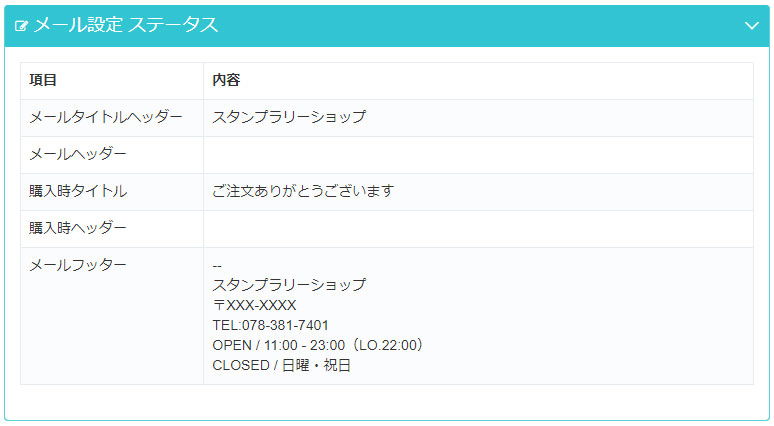 | メールタイトルヘッダー | メールのタイトルに表示する店舗名 |