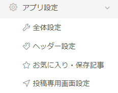 メニュー「アプリ設定」をクリックするとサブメニューが表示されます。