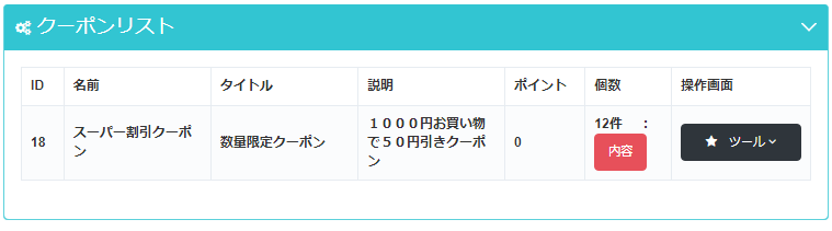 「ツール」ボタンを押すとクーポンの詳細・コピー・更新・削除ボタンが表示されます。