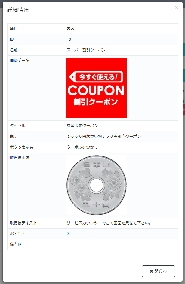 | ポイント | クーポン消し込み時に付与する来店ポイント数 |