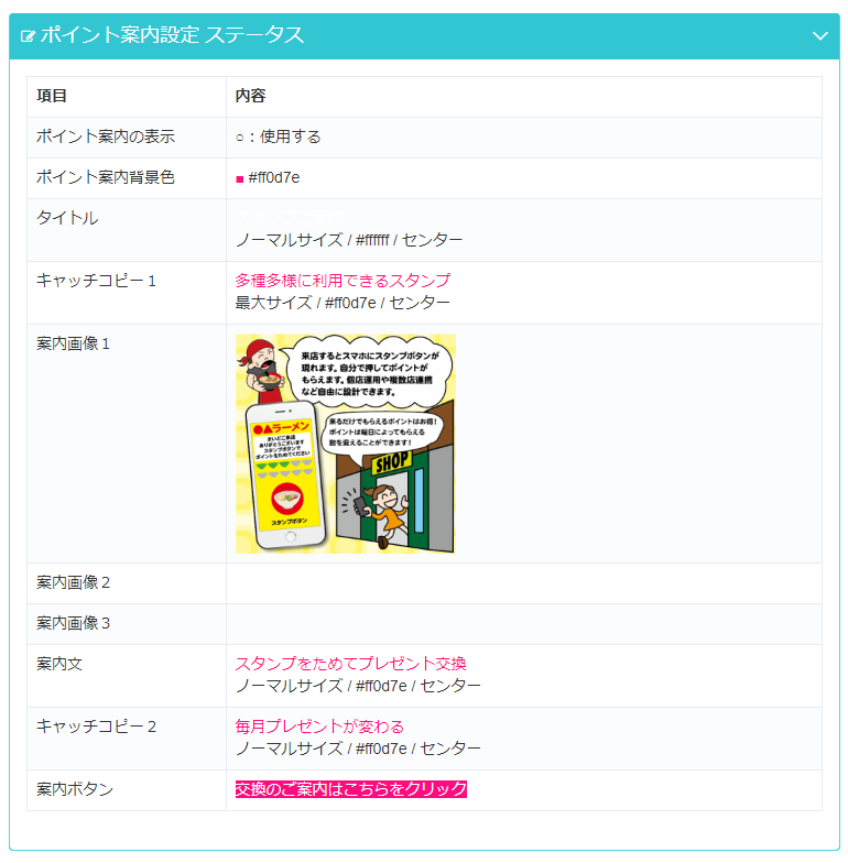 ポイント案内設定は来店ポイントを交換するプレゼント機能へ案内を利用する場合に設定します。