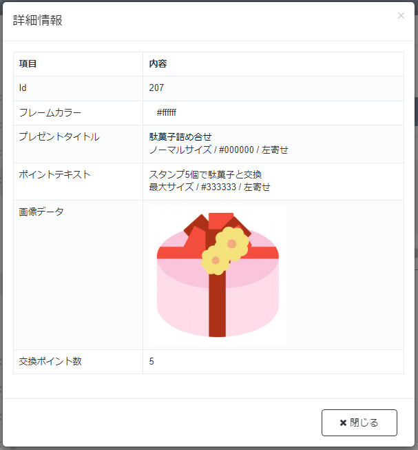 | コンテンツ | プレゼントに登録されているテキスト (プレゼントタイトル、ポイントテキスト) |