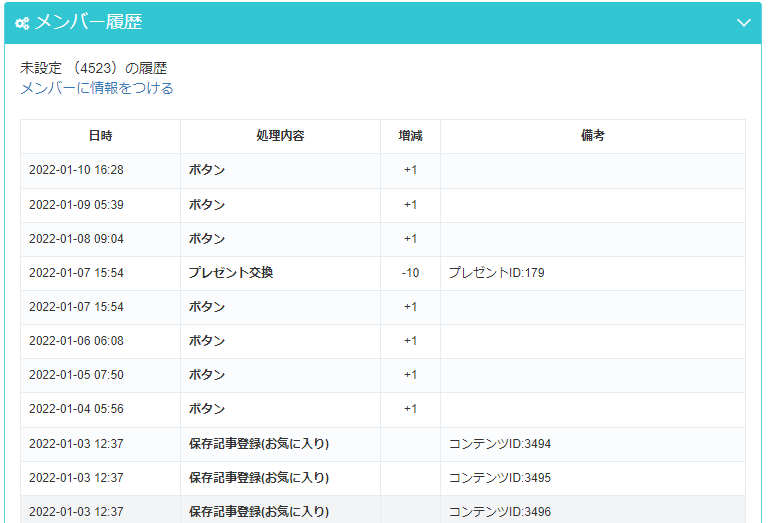 サービスを利用している特定のメンバーの行動履歴を時系列順に表示します。