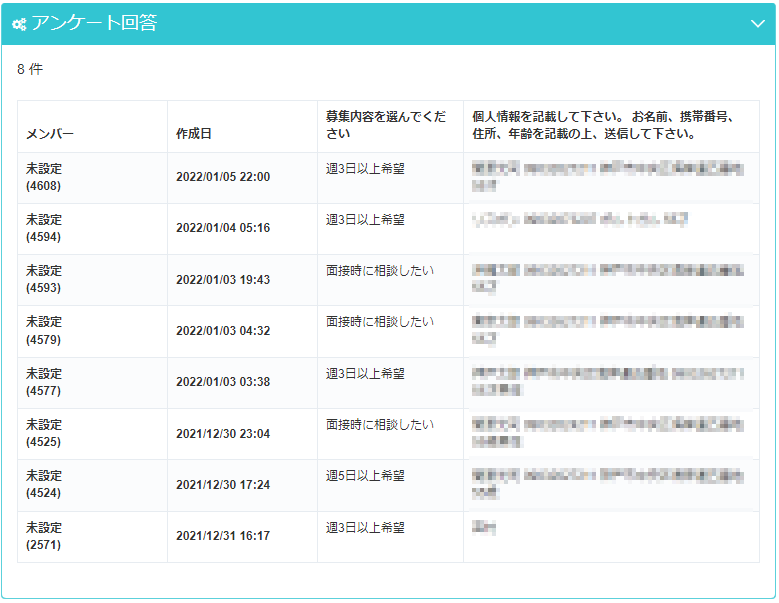「内容」ボタンを押すと該当アンケートの回答履歴が表示されます。