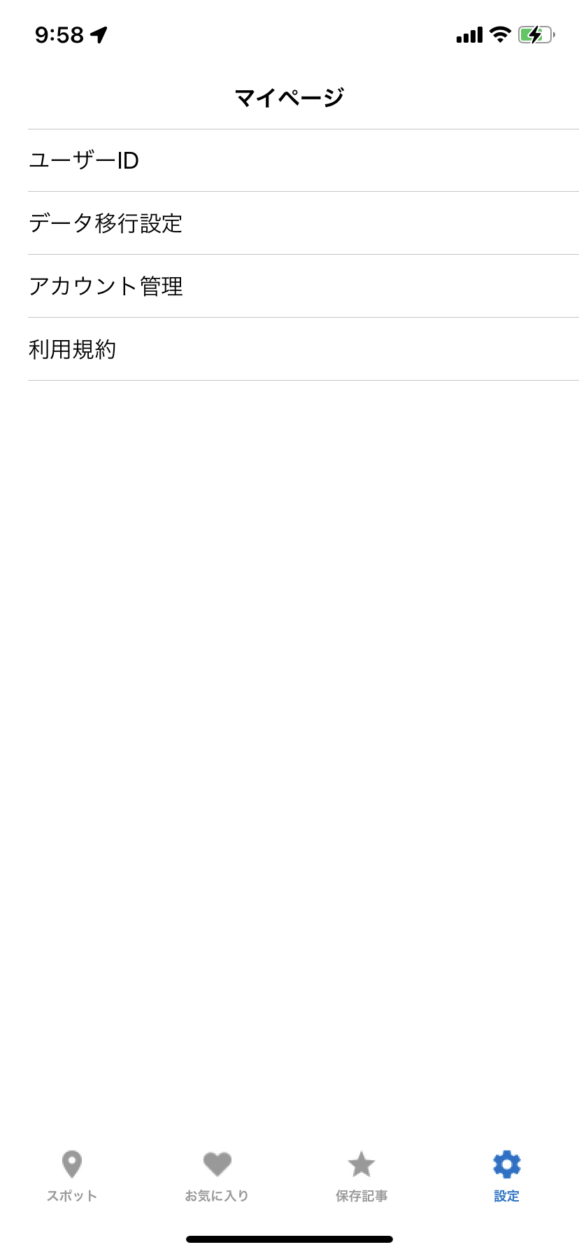 ユーザーID・利用規約の確認、データの引継ぎ・アカウント管理を設定するページです。