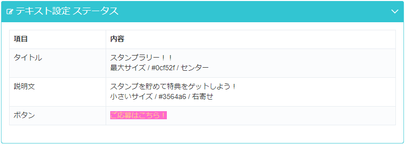 | タイトル | スポットページに表示するスタンプラリーのタイトル |